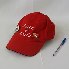 BONÉ EM BRIM VERMELHO. NA FRENTE, BORDADO EM BRANCO, 'LULA É LULA'. ACOMPANHA DOIS BÓTONS: UM EM PAPEL, 'QUERO LULA PRESIDENTE'; O OUTRO, EM METAL, COM FRENTE VERMELHA, 'JOÃO PAULO / 13'.