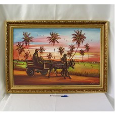 PINTURA SOBRE TELA (74X49 CM) RETRATANDO UMA CARROÇA CARREGANDO UM HOMEM, PUXADA POR UM BURRO ACOMPANHADO DE OUTRO HOMEM. AO FUNDO, CAMPO VERDE COM ALGUNS COQUEIROS. PREDOMINA OS TONS DE MARROM, AZUL E VERMELHO. NO CANTO INFERIOR DIREITO, ASSINATURA DO ARTISTA (ILEGÍVEL). MOLDURA (87X62,5 CM) DOURADA, COM DESENHOS DE ARABESCOS.