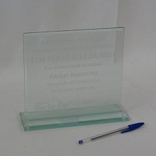 PLACA EM VIDRO (20X18X1 CM) COM A INSCRIÇÃO 'O SHOPPING NORTE SUL AGRADECE AO PRESIDENTE DA REPÚBLICA, LUIZ INÁCIO LULA DA SILVA / E AO GOVERNADOR DO ESTADO, PAULO HARTUNG / PELA OBRA DE DUPLICAÇÃO DA RODOVIA NORTE SUL. VITÓRIA - ES / 24/02/2005 / SHOPPING NORTE SUL / JARDIM CAMBURI'. COLADA EM BASE (21,5X7X1 CM) DE MESMO MATERIAL.