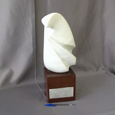 ESCULTURA ESCULPIDA EM MÁRMORE BRANCO (15X10X31,5 CM), NOMEADA 'ÁGUIA REAL', COM FORMA ABSTRAÍDA, LEMBRANDO UMA ÁGUIA. NA PARTE POSTERIOR, 'VALDIERI MARTIN / 1991'. FIXADA EM BASE DE MADEIRA IPÊ (15X15X15 CM), ONDE HÁ, NA FRENTE, PLACA METÁLICA COM A INSCRIÇÃO 'EXCELENTÍSSIMO SENHOR PRESIDENTE DA REPÚBLICA LULIZ INACIO LULA DA SILVA / UMA HOMENAGEM DA APL ROCHAS DO ESPÍRITO SANTO / FEVEREIRO 2005'; ATRÁS, 'ÁGUIA REAL / VALDIERI MARTIN ESCULTOR / CACHOEIRO DE ITAPEMIRIM / E.S. / 1991'.