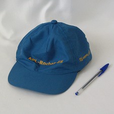 BONÉ EM TACTEL AZUL, COM INSCRIÇÃO LARANJA NA FRENTE 'APL - ROCHAS - ES'. NAS LATERAIS, 'CETEMEG / SINDIROCHAS' E 'MAQ ROCHAS / CREDIROCHAS' E LOGOMARCAS.