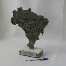 ESCULTURA NA FORMA DO MAPA DO BRASIL (28,5X19X1 CM), COM O ESTADO DO ESPÍRITO SANTO DESTACADO, CONFECCIONADA EM MÁRMORE ESVERDEADO. BASE EM MÁRMORE E GRANITO (14,8X8X4 CM) COM QUATRO TIPOS DIFERENTES. NA FRENTE, PLACA METÁLICA COM A INSCRIÇÃO 'AO PRESIDENTE LUIZ INÁCIO LULA DA SILVA / AS HOMENAGENS DO ESPÍRITO SANTO, MAIOR PRODUTOR DE PEDRAS ORNAMENTAIS DO PAÍS. GOVERNO DO ESTADO DO ESPÍRITO SANTO / FEVEREIRO DE 2005'.