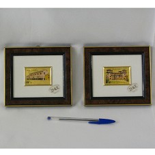 DOIS QUADROS. DUAS CROMOLITOGRAFIAS (6X4 CM CADA) PRENSADAS MANUALMENTE EM FOLHA DE OURO DE 23K, COM MOLDURAS SEPARADAS (15,5X13,5 CM) NA COR MARROM, COM DETALHES EM PRETO E DOURADO, E PASSE-PARTOUT EM BRANCO. A PRIMEIRA, 'MANTOVA - PALAZZO DUCALE', MOSTRA FACHADA DE UMA CONSTRUÇÃO COM TRÊS ANDARES, ONDE NO PRIMEIRO HÁ COLUNAS COM ARCOS OGIVAIS. A SEGUNDA, 'MANTOVA - CASTELLO S. GIORGIO', MOSTRA FACHADA DE UM CASTELO. AMBAS POSSUEM ASSINATURA DO ARTISTA GRAVADA, MAS ILEGÍVEL. ATRÁS DE CADA QUADRO, CERTIFICADO DE AUTENTICIDADE; E, DE UM DELES, DEDICATÓRIA DO REMETENTE.
