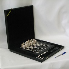 JOGO DE XADREZ E DAMA COMPOSTO POR UM TABULEIRO (25X25 CM) EM MÁRMORE PRETO E BRANCO-ROSADO; TRINTA E DUAS PEÇAS DE XADREZ, NAS CORES DO TABULEIRO; E VINTE E QUATRO PEÇAS DE DAMA. ACONDICIONADO EM CAIXA (37X34,5X4 CM) FORRADA DE NAPA PRETA.