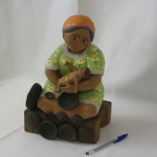 ESCULTURA (21X15X33 CM) ESCULPIDA EM MADEIRA, MOSTRANDO UMA MULHER SENTADA COM UMA CRIANÇA NOS BRAÇOS, E DIVERSAS PANELAS DE BARRO A SUA FRENTE, COMO SE ESTIVESSE EXPONDO AS MESMAS. ATRÁS, 'OFICINA ANA PAULA CASTRO / (27) 3345-0411 / EDIMILSON'. ACONDICIONADA EM CAIXA DE MADEIRA (26X21X40,5 CM) COM FRENTE TIPO VITRINE, PATINADA EM BRANCO E COM ALÇA EM CORDA.