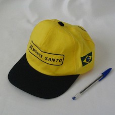 BONÉ EM TECIDO AMARELO, COM ABA PRETA. NA FRENTE, 'MONTE SANTO'. NA LATERAL, BANDEIRA DO BRASIL; E, ATRÁS, '[email protected]'.