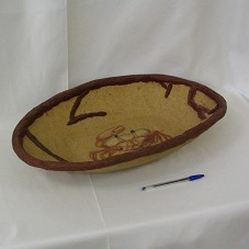 GAMELA (58X35,5X10,5 CM) CONFECCIONADA ARTESANALMENTE A PARTIR DA FIBRA DE CANA, EM TOM OCRE, COM BORDAS E DETALHES EM MARROM. NO INTERIOR, DESENHO DE UM SIRI PINTADO. ACOMPANHA INFORMATIVO SOBRE A PEÇA. ACONDICIONADA EM CAIXA FORRADA COM PAPEL CRAFT.