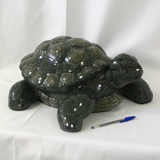 ESCULTURA (43X38X20,5 CM) EM FORMATO DE TARTARUGA, EM TONALIDADES DE VERDE E CINZA, COBERTA POR CACOS DE VIDRO, FORMANDO UM MOSAICO.