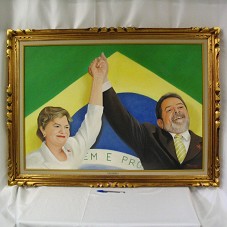PINTURA EM TELA (99X69,5 CM) RETRATANDO O PRESIDENTE LUIZ INÁCIO LULA DA SILVA AO LADO DE SUA ESPOSA, A PRIMEIRA DAMA, DE MÃOS DADAS E ESTICADAS AO ALTO, TENDO A BANDEIRA DO BRASIL AO FUNDO. NO CANTO INFERIOR DIREITO, ASSINATURA DO ARTISTA 'C MENCARONI 2004'. ATRÁS, 'O. S. TELA - 11.2004 / OBRA: PRESIDENTE LUÍZ I. LULA DA SILVA E SUA ESPOSA Dª MARISA / AUTOR: CELSO FERNANDO MENCARONI / Nº 0244'. MOLDURA (117,5X87 CM) EM MADEIRA COM PÁTINA DOURADA E ENTALHES EM ALTO RELEVO, PASSE-PARTOUT BEGE COM FRISO DOURADO. NA PARTE INFERIOR DA TELA, PLACA COM NOME DO ARTISTA.