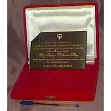 PLACA (11X16CM) EM METAL DOURADO, TRAZENDO O BRASÃO DO SÃO PAULO FUTEBOL CLUBE E A INSCRIÇÃO 'O SÃO PAULO FUTEBOL CLUBE, SOLIDÁRIO E PARTICIPANTE DO PROGRAMA ´FOME ZERO`, DESEJA SAUDAR NA PESSOA DO PRESIDENTE DA REPÚBLICA, EXCELENTÍSSIMO SENHOR LUIZ INÁCIO LULA DA SILVA, TODOS AQUELES QUE ESTÃO ENGAJADOS NESSE MOVIMENTO DE REDENÇÃO NACIONAL. / BRASÍLIA, 17 DE MARÇO DE 2003'. ACONDICIONADA EM ESTOJO VERMELHO.