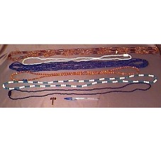 SEIS GUIAS CONFECCIONADAS EM CONTAS DE ACRÍLICO, SENDO: UMA NA COR MARROM (82CM); UMA NA COR LARANJA (64CM), COM DUAS CONTAS AZUIS; UMA NA COR BRANCA (59CM); DUAS NA COR AZUL (65CM E 68CM); E UMA NAS CORES BRANCO E AZUL (73CM). UM PINGENTE EM METAL, NA COR COBRE, REPRESENTANDO UM MACHADO DE DOIS GUMES.