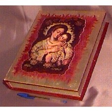 CAIXA (05X23X27CM) EM MADEIRA, TRAZENDO NA TAMPA UMA ESTAMPA DE MARIA COM O MENINO JESUS NOS BRAÇOS, PREDOMINANDO O VERMELHO E O DOURADO.
