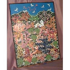 QUADRO (126X176CM) CONTENDO PINTURA FEITA SOBRE LINHAGEM, RETRATANDO UM HOMEM NEGRO, VESTIDO DE BRANCO E COM ADEREÇOS NOS PUNHOS, NA BARBA E NA ORELHA, AO LADO DE POTES E ERVAS, PREPARANDO ALGO EM UM CALDEIRÃO; DIANTE DE SUA TESTA VÊ-SE UMA COBRA, ENROLADA EM UM RAMO, FITANDO UMA POMBA BRANCA; SÍMBOLOS DO CANDOMBLÉ FORMAM UM SEMI QUADRANTE SOBRE FUNDO VERDE; ENQUADRANDO TODA A CENA, TEMAS ABSTRATOS ESTÃO DISPOSTOS SOBRE FUNDO VINHO. MOLDURA EM MADEIRA ENTALHADA E PINTADA, PODENDO SER OBSERVADOS UM OLHO NA PARTE SUPERIOR, FOLHAS, TRIÂNGULOS, CÁLICE, MORINGA E BÚZIOS NAS LATERAIS E GALHO COM FOLHAS NA PARTE INFERIOR.