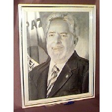 QUADRO (45X36CM) CONTENDO DESENHO EM GRAFITE DA EFÍGIE DO PRESIDENTE LULA. MOLDURA EM MADEIRA BRANCA, COM FRISO DOURADO.