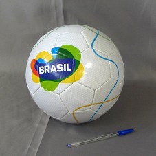 BOLA DE FUTEBOL NA COR BRANCA, COM DETALHES EM VERDE, AZUL E LARANJA. NA FRENTE, DESENHO AMORFO, AMEBÓIDE, NAS MESMAS CORES, TENDO NO CENTRO A INSCRIÇÃO 'BRASIL'. DO OUTRO LADO, 'PENALTY'. BOLA EM COURO COM REVESTIMENTO PLÁSTICO.