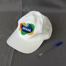 BONÉ EM TECIDO BRANCO. NA FRENTE, BORDADO DE DESENHO AMORFO, AMEBÓIDE, NAS CORES VERDE, LARANJA, AZUL E VERMELHO, TENDO NO CENTRO A INSCRIÇÃO 'BRASIL'.