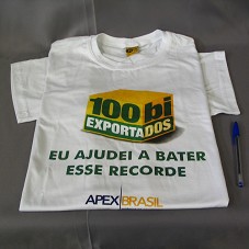 CAMISETA EM MALHA BRANCA (TAM GG). NA FRENTE, ESTAMPA EM VERDE E AMARELO, DESENHO DE UMA CAIXA COM A INSCRIÇÃO '100 BI / EXPORTADOS / EU AJUDEI A BATER ESSE RECORDE / APEX BRASIL / AGÊNCIA DE PROMOÇÃO DE EXPORTAÇÕES E INVESTIMENTOS'.