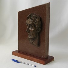 ESCULTURA (19X6,5X29 CM) EM MÁRMORE MARROM, MOSTRANDO A FACE DE SÍMON BOLÍVAR ESCULPIDA E PRESA À BASE DE MESMO MATERIAL. NA PARTE POSTERIOR, NEGATIVO DA FACE, ESCULPIDO NA BASE DE MÁRMORE, E PLACA METÁLICA COM A INSCRIÇÃO 'LUIZ INACIO LULA DA SILVA / ... / POR LA LIBERTAD DE LOS PUEBLOS DEL MUNDO AÚN CLAMAN LAS SOLIDARIEDADES Y LAS LUCHAS QUE LA REDIMAN DE TODAS SUS MISERIAS Y OPRESIONES / ... / BOLIVAR VIVE / ...'. APARAFUSADA EM BASE DE MADEIRA (23X9,5X2 CM).