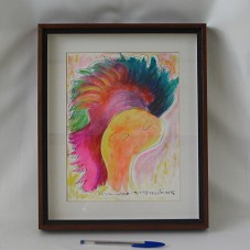 QUADRO (31X37,5X4 CM), TIPO CAIXA DE VIDRO, COM PINTURA EM AQUARELA (20,5X27,5 CM). PINTURA PREDOMINANDO OS TONS DE ROSA, VERDE, AMARELO E LARANJA, MOSTRANDO O QUE PARECE SER UMA CABEÇA COM PENUGENS COLORIDAS NO TOPO. CONTORNO DO DESENHO EM LINHA CONTÍNUA, TERMINANDO COM A ASSINATURA DA ARTISTA, 'ANA ROSA ANGARITA 2005', NA PARTE INFERIOR. ACONDICIONADO EM CAIXA DE MADEIRA.
