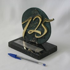 ESCULTURA EM BRONZE (14,5X1X14 CM), FORMATO DE UM CÍRCULO COM FIGURA DE UM CEDRO NA FRENTE, E, EM PRIMEIRO PLANO, '125', EM DOURADO. PRESA À BASE DE MÁRMORE/GRANITO PRETO, ONDE HÁ UMA PLACA METÁLICA COM A INSCRIÇÃO 'A COMUNIDADE E ENTIDADES LÍBANO-BRASILEIRAS DE SÃO PAULO / AGRADECEM AO EXCELENTÍSSIMO SR. LUIZ INÁCIO LULA DA SILVA / .... / A SUA HONROSA PARTICIPAÇÃO NA COMEMORAÇÃO DOS 125 ANOS DE IMIGRAÇÃO LIBANESA NO BRASIL / SÃO PAULO, 31 DE MARÇO DE 2005'. ACONDICIONADA EM SACO DE VELUDO PRETO.