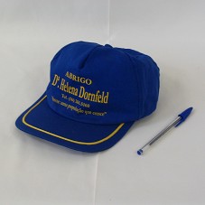 BONÉ EM BRIM AZUL, COM ESTAMPA AMARELA NA FRENTE, CONTENDO A INSCRIÇÃO 'ABRIGO Dª. HELENA DORNFELD / TEL. (16) 261.5160 / IDOSOS: UMA POPULAÇÃO QUE CRESCE'.