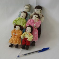 SEIS BONECOS DE PANO (15 CM) COMPONDO UMA FAMÍLIA: UM CASAL DE AVÓS; UM CASAL DE PAIS, COM A MÃE SEGURANDO O BEBÊ; E, UM CASAL DE CRIANÇAS. TODOS POSSUEM ARMAÇÃO INTERNA EM ARAME.