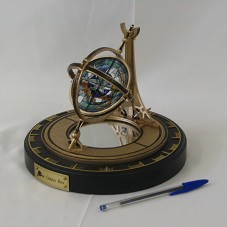 ESCULTURA (22X22X14 CM) DE UM GIROSCÓPIO (INSTRUMENTO NÁUTICO DE ORIENTAÇÃO), EM METAL PINTADO DE DOURADO, PRESO À BASE CIRCULAR PRETA, DE MADEIRA, ONDE HÁ INDICAÇÃO DO NORTE. NO CENTRO, UM ESPELHO; E, NOS ARCOS DO INSTRUMENTO, CÍRCULO EM VIDRO COM PINTURA DOS PONTOS CARDEAIS (ROSA DOS VENTOS). NA FRENTE DA BASE, 'EDS / COMPAS ROSE'. ACOMPANHA CARTÃO 'COMPAS ROSE', COM BREVE DESCRIÇÃO DO OBJETO E SIGNIFICADO PARA A EMPRESA 'EDS'. ACONDICIONADO EM CAIXA PRETA, COM ETIQUETA DA EMPRESA NA TAMPA.