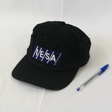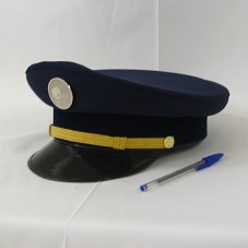 QUEPE, EM TECIDO AZUL MARINHO, COM ABA PRETA E DETALHE EM FITA DOURADA COM BÓTON NA MESMA COR. NA FRENTE, BÓTON CIRCULAR EM METAL PRATEADO, COM A INSCRIÇÃO 'EDS', LOGOMARCA DA EMPRESA.