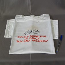 CAMISETA (TAM GG) EM MALHA BRANCA, GOLA CARECA, COM DETALHE VERMELHO E AMARELO NA BARRA. NA FRENTE, ESTAMPA COM ROSTO ESTILIZADO DE UM CASAL DE CRIANÇAS E 'ESCOLA MUNICIPAL DE DANÇA IRACEMA NOGUEIRA'. ATRÁS, UM SOL E 'MORADA DA CIDADANIA / PREFEITURA DE ARARAQUARA'.