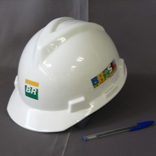 CAPACETE DE OBRA, NA COR BRANCA. NA FRENTE, MARCA DA PETROBRÁS, 'BR'. NAS LATERAIS, ADESIVO COM LOGOMARCA DO GOVERNO FEDERAL 'BRASIL UM PAÍS DE TODOS'.