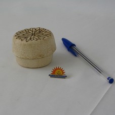 PORTA-JÓIA (6X3,7 CM), DE FORMATO CIRCULAR, CONFECCIONADO EM CASCA DE LARANJA, COM DESENHOS GRAVADOS NA TAMPA. NO FUNDO, 'ARTE DA TERRA / ARARAQUARA'. ACOMPANHA BÓTON EM METAL, FORMATO DE UM SOL COM A INSCRIÇÃO 'MORADA DA CIDADANIA / PREFEITURA DE ARARAQUARA'.