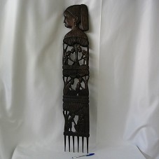 ESCULTURA EM MADEIRA (17X1,5X96,5 CM), TIPO TALHA. NO TOPO, PERFIL DE UMA MULHER, COM CABELOS EM RABO DE CAVALO. ABAIXO DELA, EM TRÊS NÍVEIS, SEIS FIGURAS MASCULINAS TRABALHANDO (DUAS EM CADA NÍVEL). NA PARTE INFERIOR DA PEÇA, SEIS ESPETOS, LEMBRANDO DENTES DE PENTE.