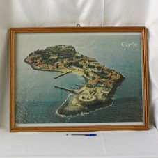 QUADRO (71X53 CM) EMOLDURANDO FOTOGRAFIA (65X45 CM) DE UMA ILHA, COM DIVERSAS CASAS E UMA FORTIFICAÇÃO. NO CANTO SUPERIOR DIREITO, 'GORÉE'.