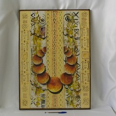 QUADRO (50X70 CM) COM PINTURA EM TONS DE MARROM E BEGE, SOBRE TELA, COM MOTIVOS GEOMÉTRICOS, LEMBRANDO ESTAMPAS DE CIVILIZAÇÕES ANTIGAS. POSSUI DUAS FAIXAS EM BRANCO, COM RECORTES DE REVISTAS COLADOS SOBRE JUTA, E COM BÚZIOS SOBRE ELE. NO CENTRO INFERIOR, PINTURAS DE ESFERAS SOBREPOSTAS, FORMANDO UM CÍRCULO. NO CANTO INFERIOR DIREITO, INSCRIÇÃO QUE PARECE SER ASSINATURA DO ARTISTA. ATRÁS, CARTÃO DO ARTISTA E 'LA FAIM & LES MOYENS / TECHNIQUE MIXTE / 50CMX70CM / GORÉE 2005'.