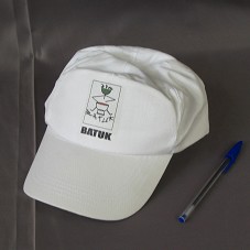 BONÉ EM TECIDO BRANCO. NA FRENTE, 'BATUK' E ESTAMPA COM DESENHO ESTILIZADO DE UM HOMEM TOCANDO TAMBOR. ATRÁS, [email protected]'.