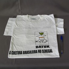 CAMISETA (TAM XL) EM MALHA BRANCA, DE MANGA CURTA. NA FRENTE, 'BATUK / A CULTURA BRASILEIRA NO SENEGAL' E ESTAMPA COM DESENHO ESTILIZADO DE UM HOMEM TOCANDO TAMBOR. ATRÁS, '[email protected]'.