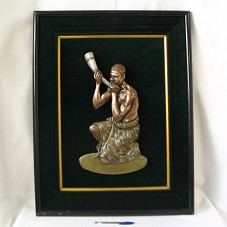 ESCULTURA DE PAREDE (27,5X3X45 CM) EM BRONZE, MOSTRANDO UM NEGRO AJOELHADO TOCANDO UM CHIFRE, COMO INSTRUMENTO. FIXADA EM MOLDURA (63,5X83 CM) COM FUNDO EM VELUDO VERDE ESCURO E DETALHE DOURADO. ATRÁS, ETIQUETAS COM INFORMAÇÕES SOBRE A PEÇA.