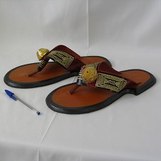 UM PAR DE SANDÁLIAS DE DEDO. SOLADO EM MADEIRA COM BORDAS PINTADAS DE PRETO; E TIRAS EM COURO COM DETALHES EM DOURADO, AMARELO E VERDE. ACONDICIONADA EM CAIXA DE PAPELÃO AZUL.