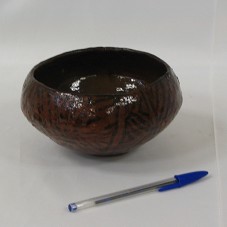 TIGELA EM CERÂMICA (16X16X8 CM) ESMALTADA EM MARROM ESCURO, COM PINTURAS GEOMÉTRICAS PRETAS.