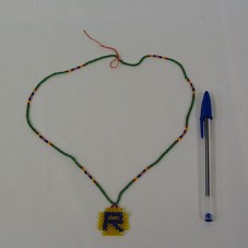 COLAR EM MIÇANGAS VERDE, VERMELHA, AMARELA E AZUL, COM PINGENTE EM AMARELO E AZUL, CONTENDO A LETRA 'R'.