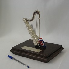 ESCULTURA EM FILIGRANA DE PRATA, FIGURA DE UMA HARPA (9X4X17 CM), COM UMA FITA DE LISTRAS VERMELHA, BRANCA E AZUL AMARRADA NA PARTE INFERIOR. FIXADA EM BASE DE MADEIRA (20X15,5X3,5 CM), ONDE HÁ UMA PLACA COM A INSCRIÇÃO 'DON OSCAR RUBEN SALOMON / PRESIDENTE / HONORABLE CÁMARA DE DIPUTADOS / REPUBLICA DEL PARAGUAY'. ACONDICIONADA EM CAIXA (22X17X21,5 CM) FORRADA DE VELUDO PRETO, COM FITA NAS MESMAS CORES DA OUTRA, NA TAMPA. ACOMPANHA CARTÃO DO REMETENTE.