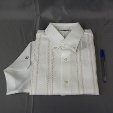 CAMISA SOCIAL (TAM 43) EM CAMBRAIA DE LINHO, NA COR BEGE, COM BORDADO VERTICAL NAS CORES MARROM E BRANCO NA PARTE FRONTAL, DE MANGA CURTA. CAMISA DESENHADA POR MARCOS ISMACHOWIEZ, DE EDIÇÃO NUMERADA 05838.