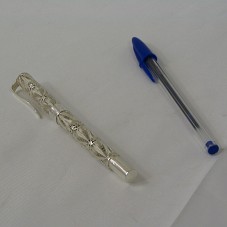 CANETA (13 CM) EM FILIGRANA DE PRATA, NA COR PRETA, COM A GRAVAÇÃO 'LULA' NO ANEL DELA. ACONDICIONADA EM CAIXA (20X4,5X2 CM) FORRADA DE VELUDO PRETO.
