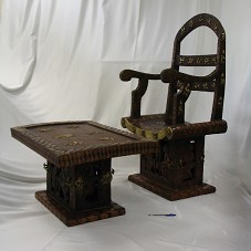 POLTRONA (62X42,5X116 CM) E MESA BAIXA (83X56X42 CM) EM MADEIRA ESCURA, ORNAMENTADAS COM MOEDAS ANTIGAS DE COBRE; ESTATUETAS DE BRONZE; BÚZIOS; E, LAMELAS TRIANGULARES DE COBRE. OS PÉS SÃO TRABALHADOS COM MESMO MATERIAIS E ESCULTURAS EM MADEIRA. CONJUNTO FAZ PARTE DA TRONO REAL BAMOUN (OESTE DE CAMARÕES), REFLETINDO A MAJESTADE REAL, O RESPLENDOR, A MAGNIFICÊNCIA E A POTÊNCIA DA REALEZA TRADICIONAL.