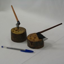 DOIS PORTA-LÁPIS (7X7X4,5 CM) EM TRONCO DE MADEIRA, CADA UM COM UM MACHADO PRESO NELE, COMO SE ESTIVESSE CORTANDO A MADEIRA. POSSUI A INSCRIÇÃO 'CASA DE CARNES SÃO JUDAS / TEL. 4127-1351'.