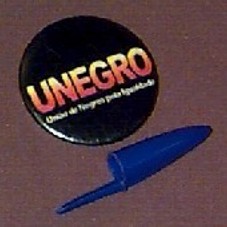 BÓTON EM METAL TRAZENDO, SOBRE FUNDO PRETO, A INSCRIÇÃO 'UNEGRO / UNIÃO DE NEGROS PELA IGUALDADE'. ACONDICIONADO EM ESTOJO PRETO.