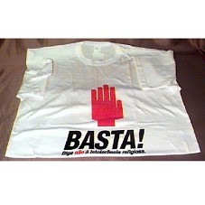 CAMISETA BRANCA TRAZENDO ESTAMPADAS UMA MÃO VERMELHA E A INSCRIÇÃO 'BASTA / DIGA NÃO À INTOLERÂNCIA RELIGIOSA'.