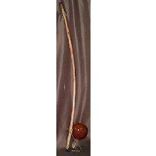BERIMBAU (151CM) DECORADO COM DESENHOS DE FOGO, DE PEGADAS DE FELINO E DA LUA. ACOMPANHAM VARETA E PEDRA, TRAZENDO ESTA A INSCRIÇÃO 'ALESSANDRA, THAINA. 22-03-99'.