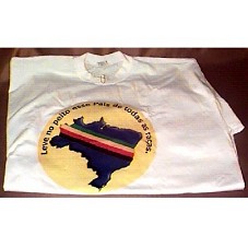 CAMISETA BRANCA TRAZENDO ESTAMPADO UM CÍRCULO AMARELO, COM O TERRITÓRIO BRASILEIRO ATRAVESSADO POR UMA FAIXA NAS CORES VERDE, AMARELO, VERMELHO E PRETO, E COM A INSCRIÇÃO 'LEVE NO PEITO ESSE PAÍS DE TODAS AS RAÇAS.'