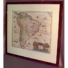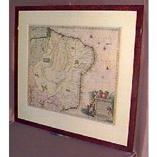 QUADRO (74X82CM) CONTENDO CARTA CARTOGRÁFICA RESTAURADA, ORIGINAL DO ANO DE 1651, ONDE É ILUSTRADO O TERRITÓRIO BRASILEIRO DE ENTÃO, COM SUAS CADEIAS DE MONTANHAS, FLORESTAS, RIOS E LOCALIZAÇÃO DAS NAÇÕES INDÍGENAS. MOLDURA EM MADEIRA ESCURA, PASSE-PARTOUT BEGE E PROTEÇÃO DE VIDRO.